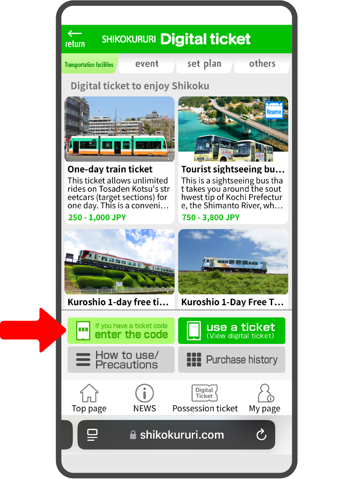 Press the "Enter code" button at the bottom of the "Digital Ticket" top page (product thumbnail). | ||